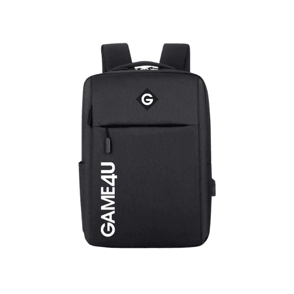 Official Game4u laptop bag: padded main laptop compartment plus accessory pockets, sized to hold the EliteBook, headset, mouse, and power supply.