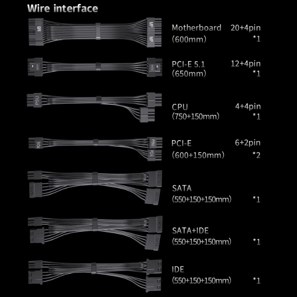 PCIe 5.1 connector1 x 12+4-pin, 650 mm